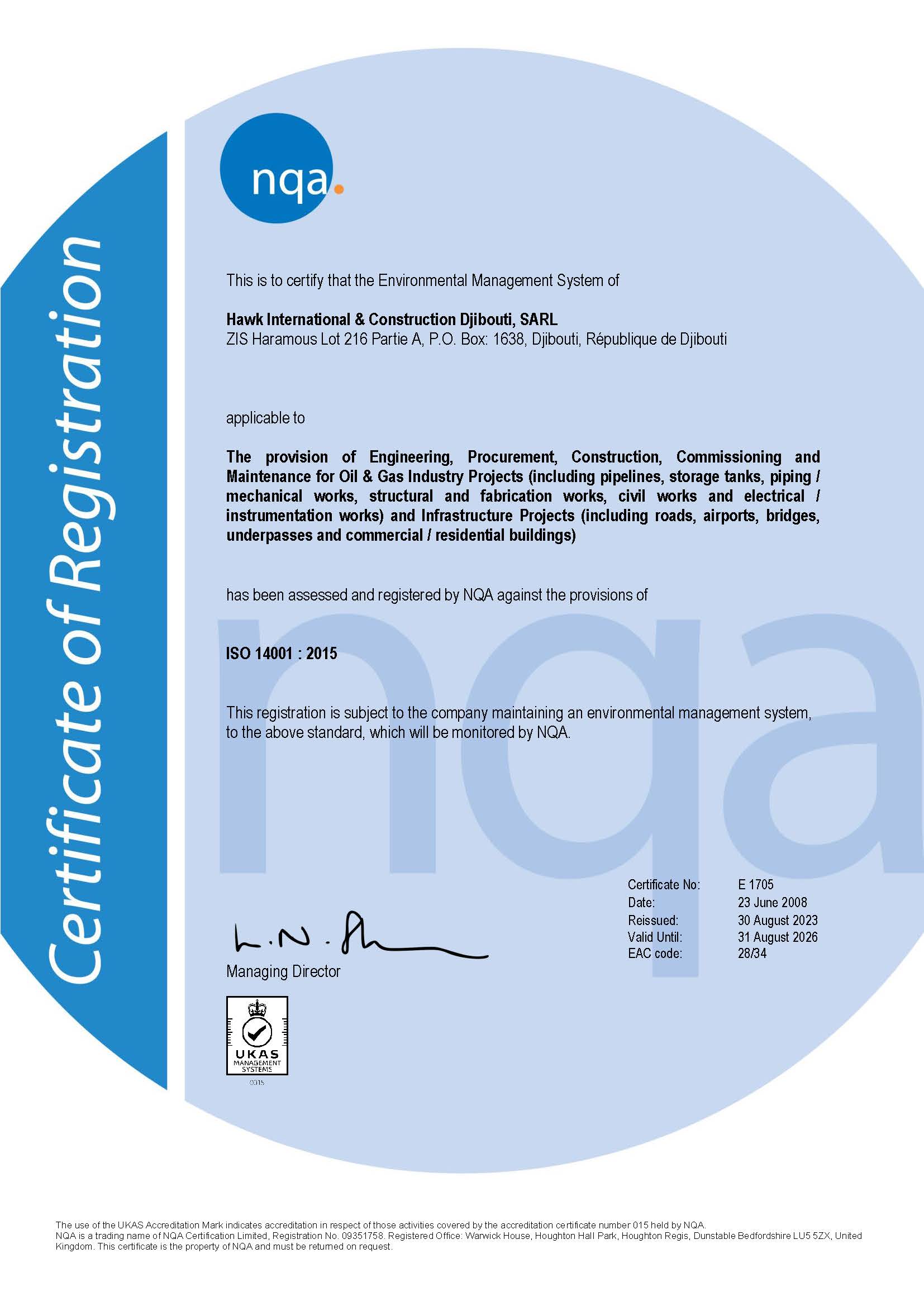 HAWK Environment Management System has been certified since 2008 by NQA Certification Limited, United Kingdom, and is currently certified to the requirements of ISO 14001:2015. (Certificate No: 1705 and valid till 31 August 2023.)