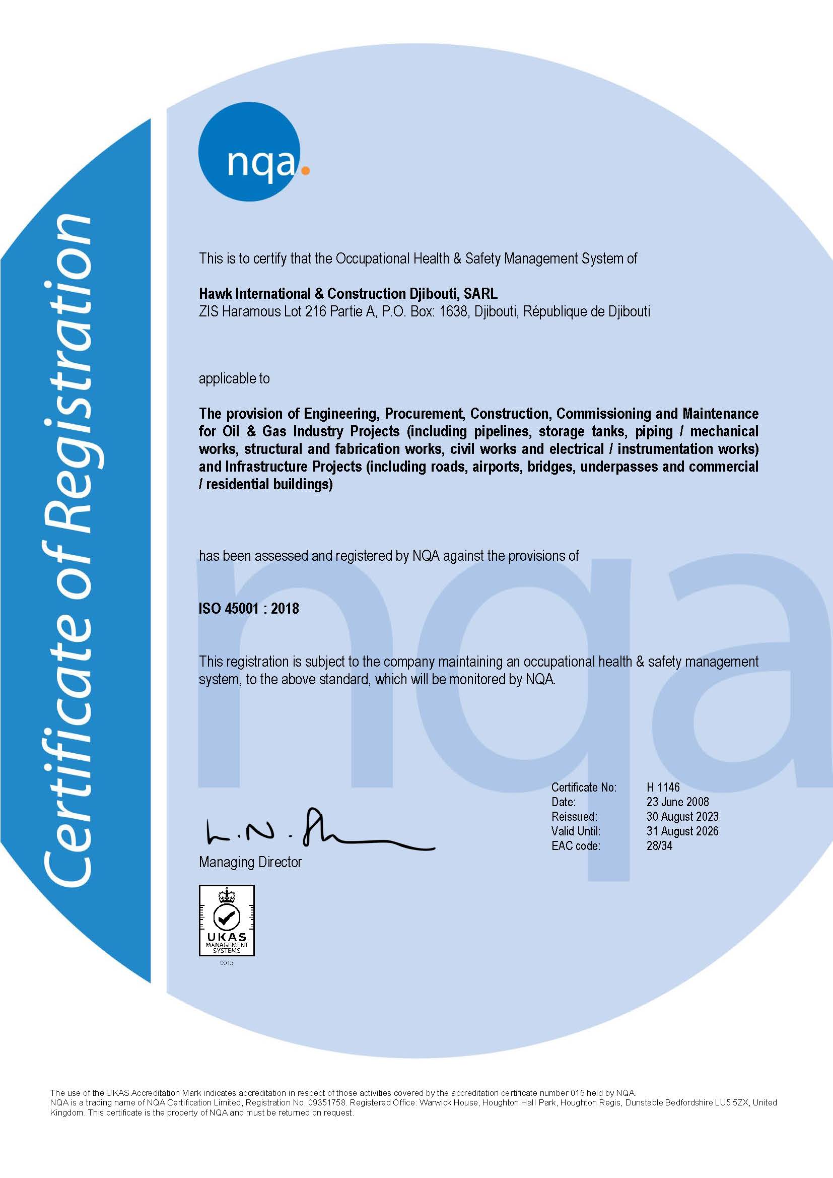 HAWK Health & Safety Management System was certified since 2008 by NQA Certification Limited, United Kingdom to BS EN OHSAS 18001:2008 and has been currently upgraded to the requirements of ISO 45001:2018 (Certificate No: H1146 and valid till 31 August 2023)