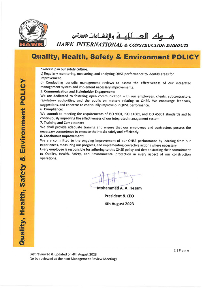 HAWK International operations are characterized by the internationality and complexity of projects, but achieves the same high standard of QHSE policies in all project activities. This is through an effective, reliable and proven multilevel Management System which involves: